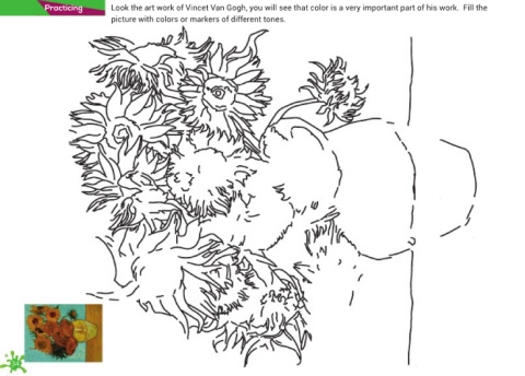 Practicing Look the art work of Vincet Van Gogh, you will see that color is a very important part of his work. Fill the picture with colors or markers of different tones. 34