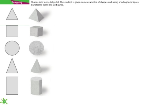 Designing Shapes into forms 2d yo 3d. The student is given some examples of shapes and using shading techniques, transforms them into 3d figures. 70